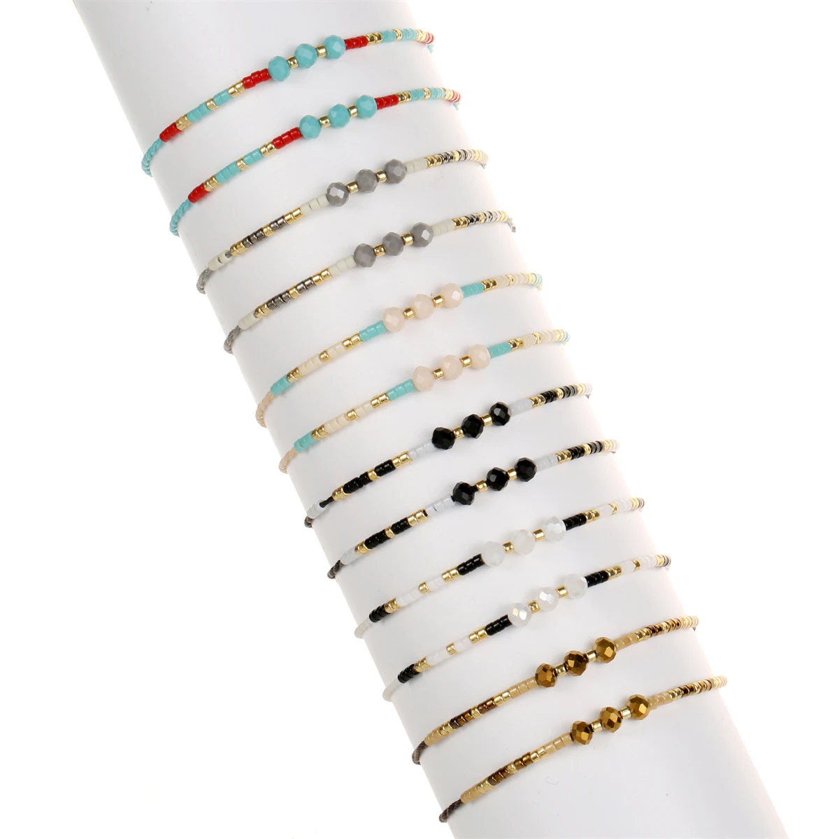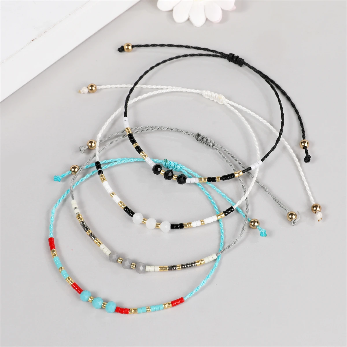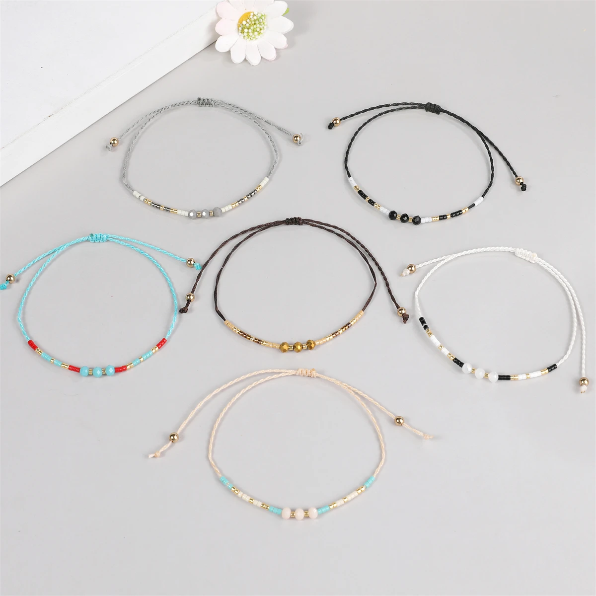 12Pcs Faceted Crystal Seeds Beaded Pearl Braceles Anklets Adjustable Braided Wax Rope Chain Wristband Cuff Boho Jewelry