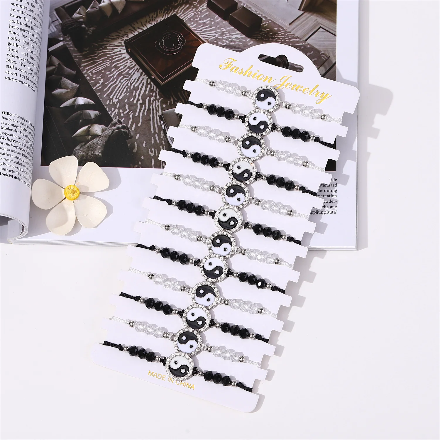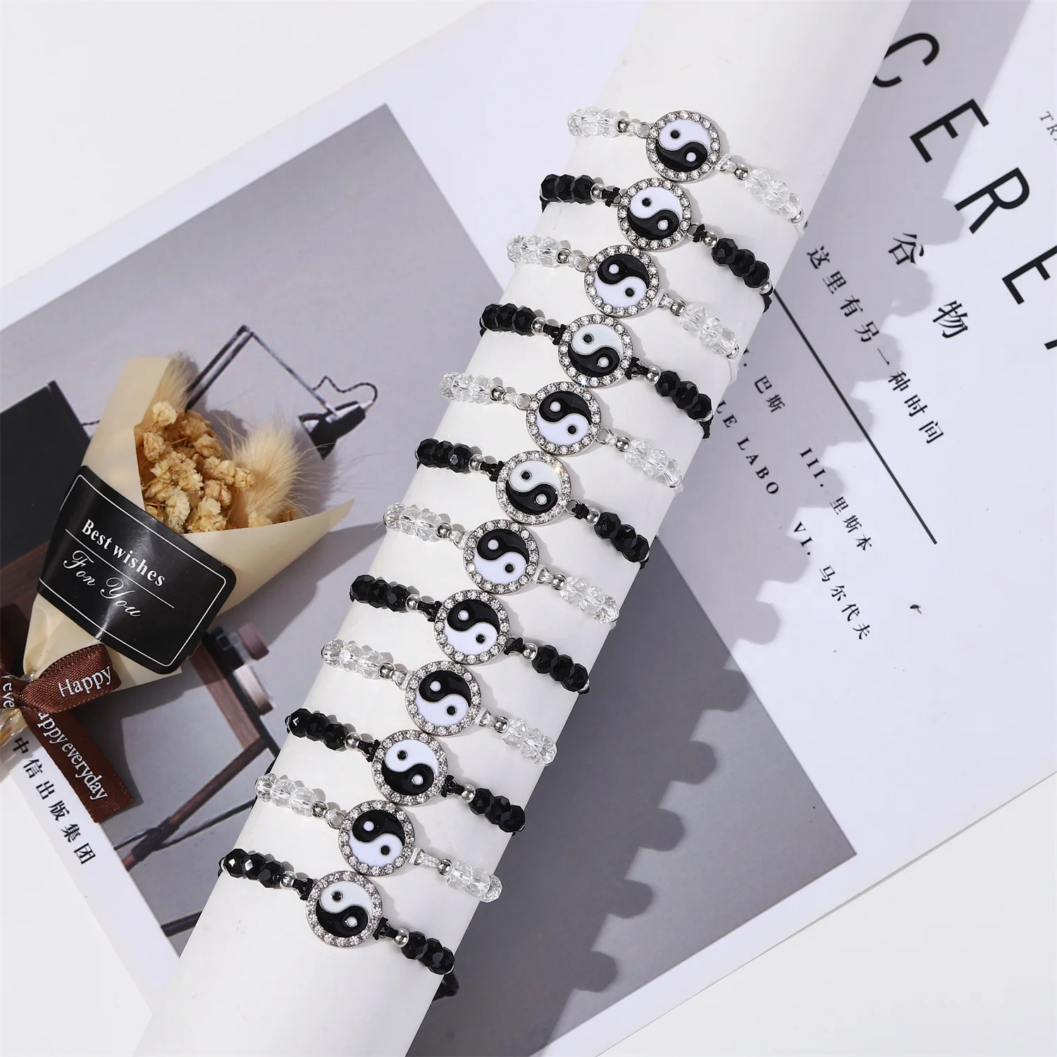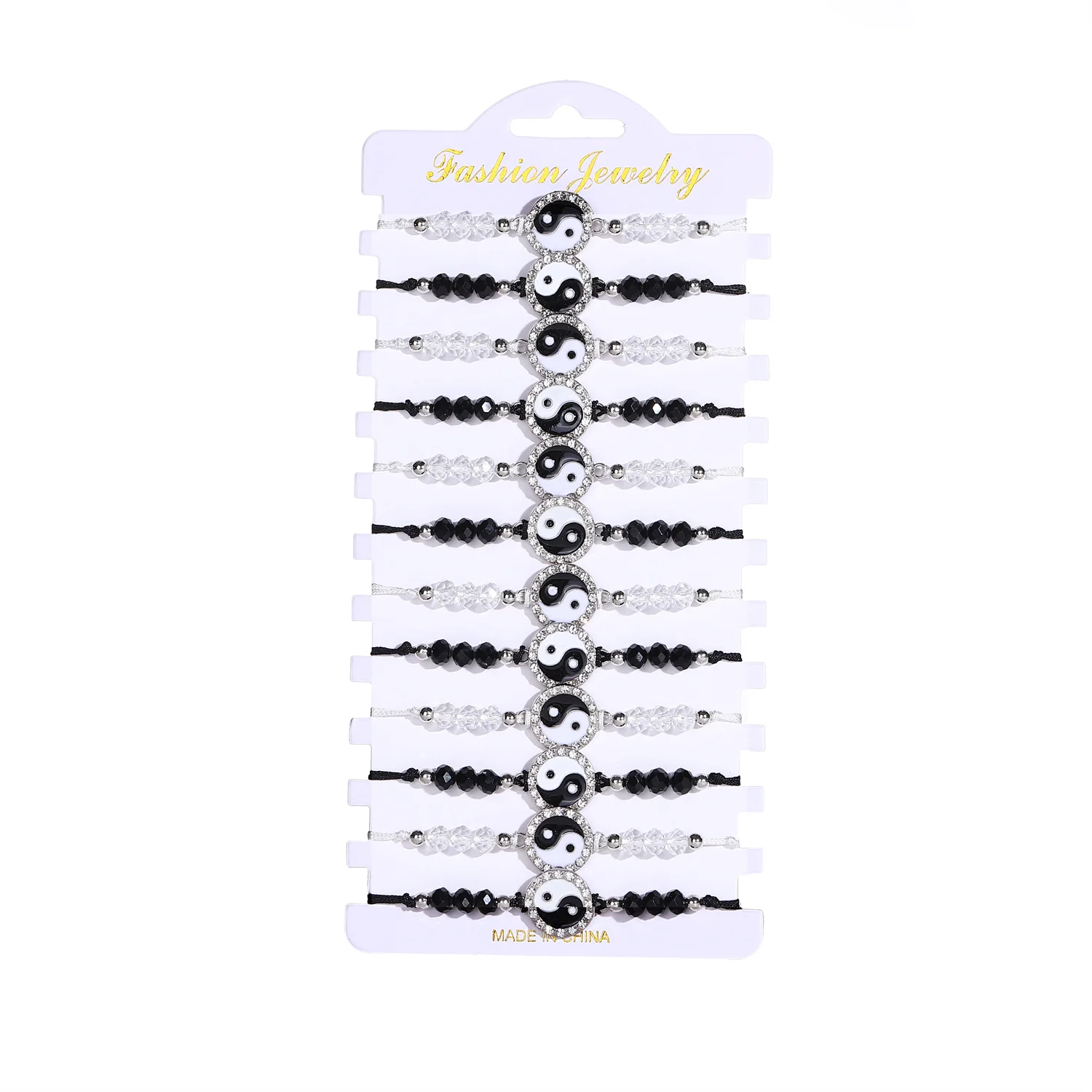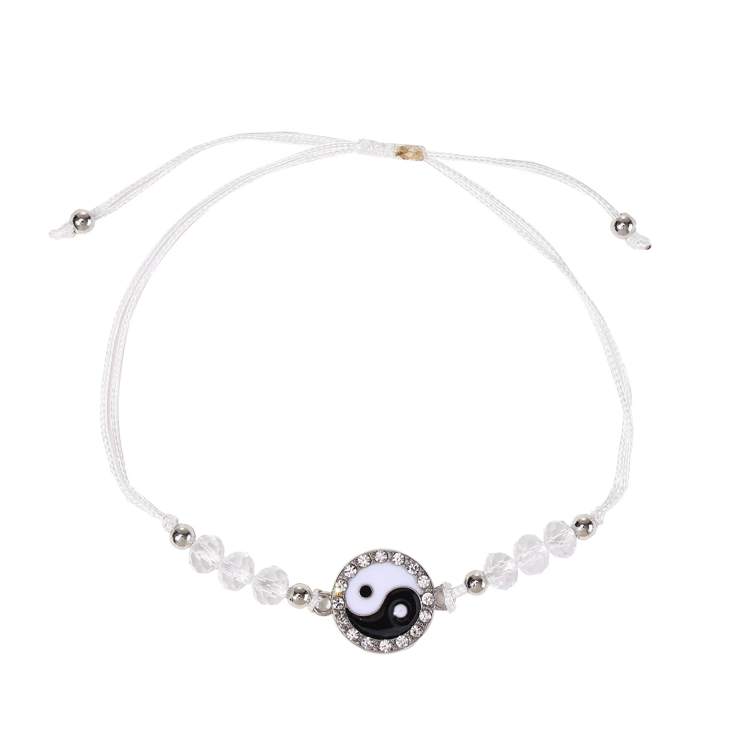 12pcs/Lot Black/white Yin and Yang Tai Chi Pendant Bracelets for Women Crystal Beads Chain Braid Rope Anklet Amulet Jewelry