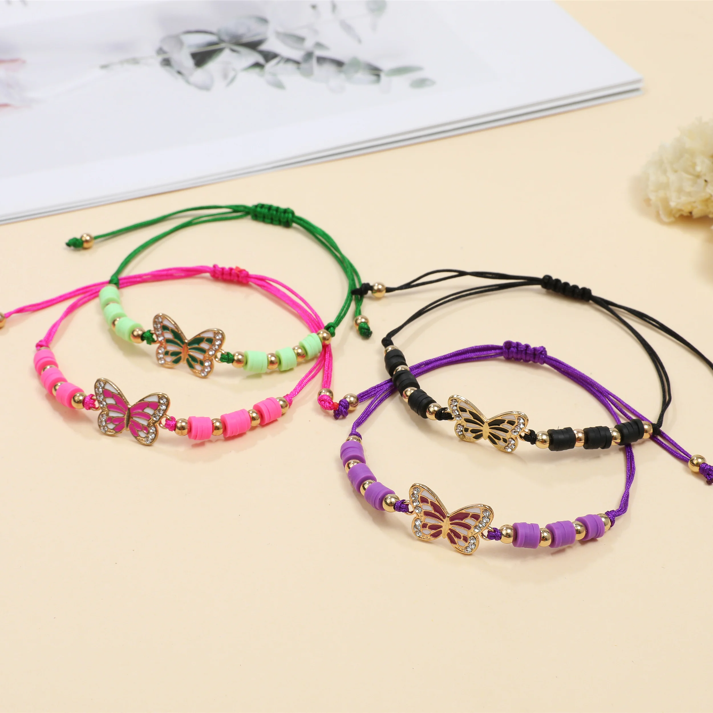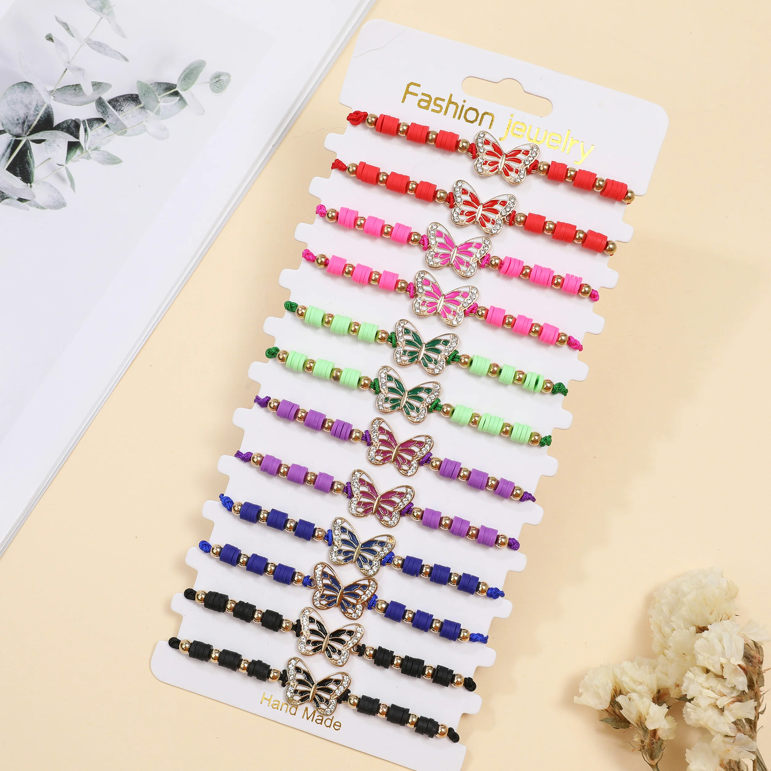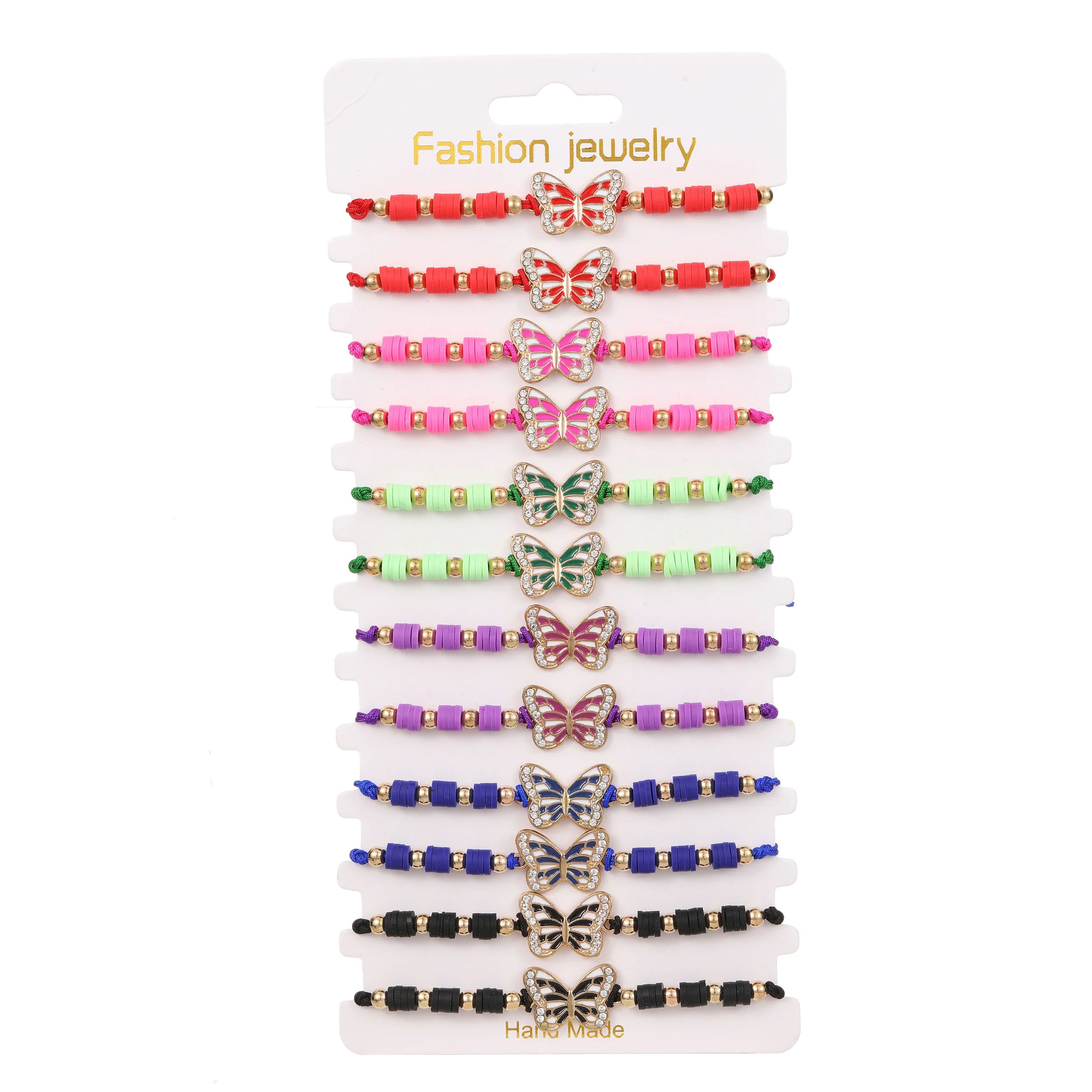 12pcs/lot Butterfly Pendant Braided Bracelets for Women Animal Colored Polymer Clay Adjustable Woven Rope Bohemia Jewelry