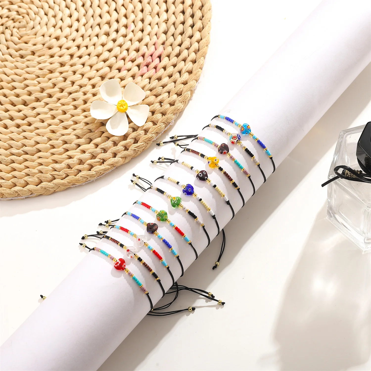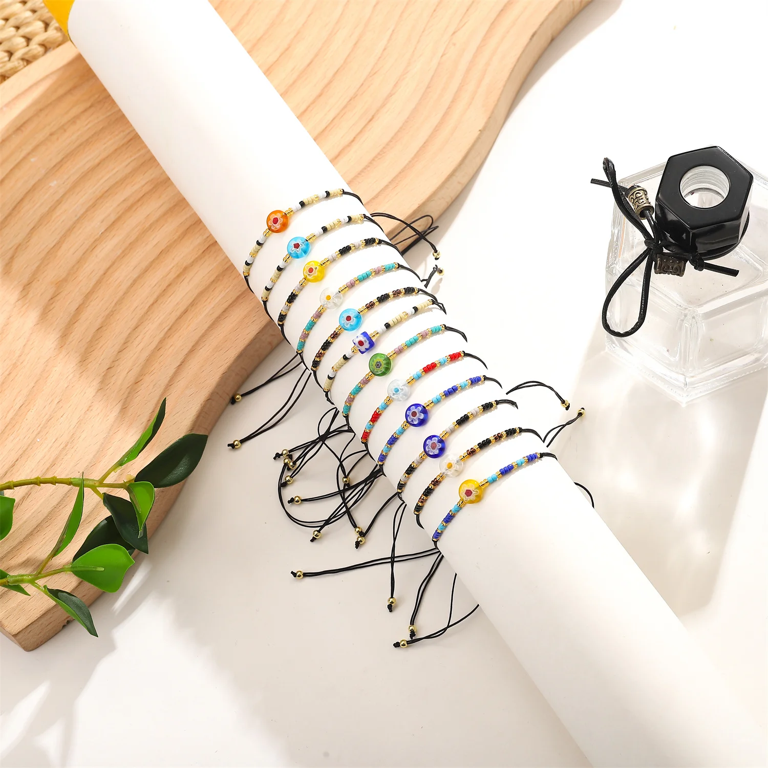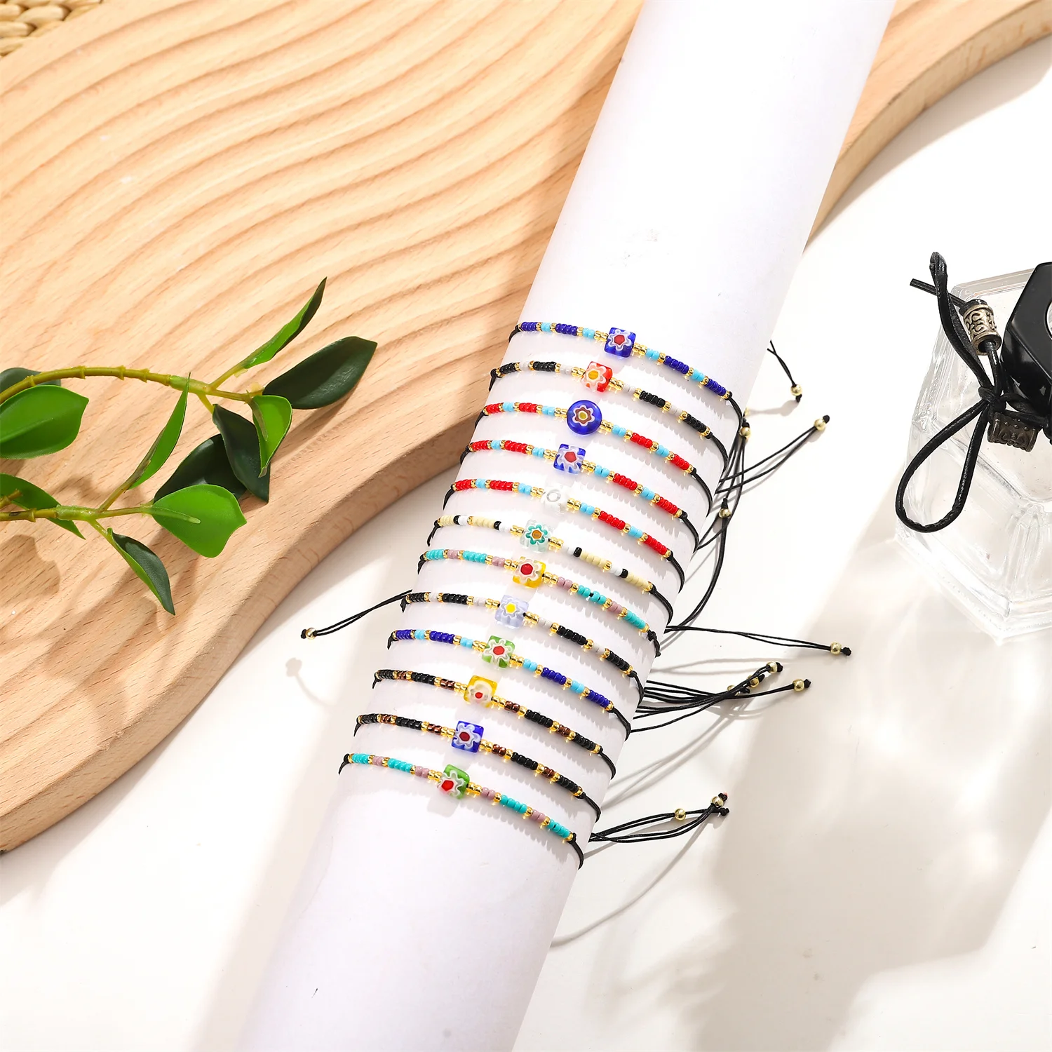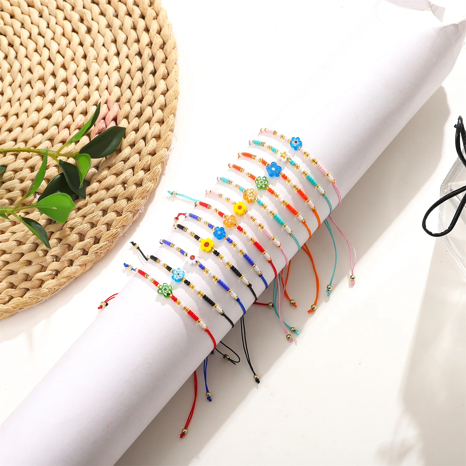 12pcs/lot Cute Flowers Bracelet Crystal Seed Bead Couple Braided Adjustable Rope Chain Bracelets for Women Friendship Jewelry