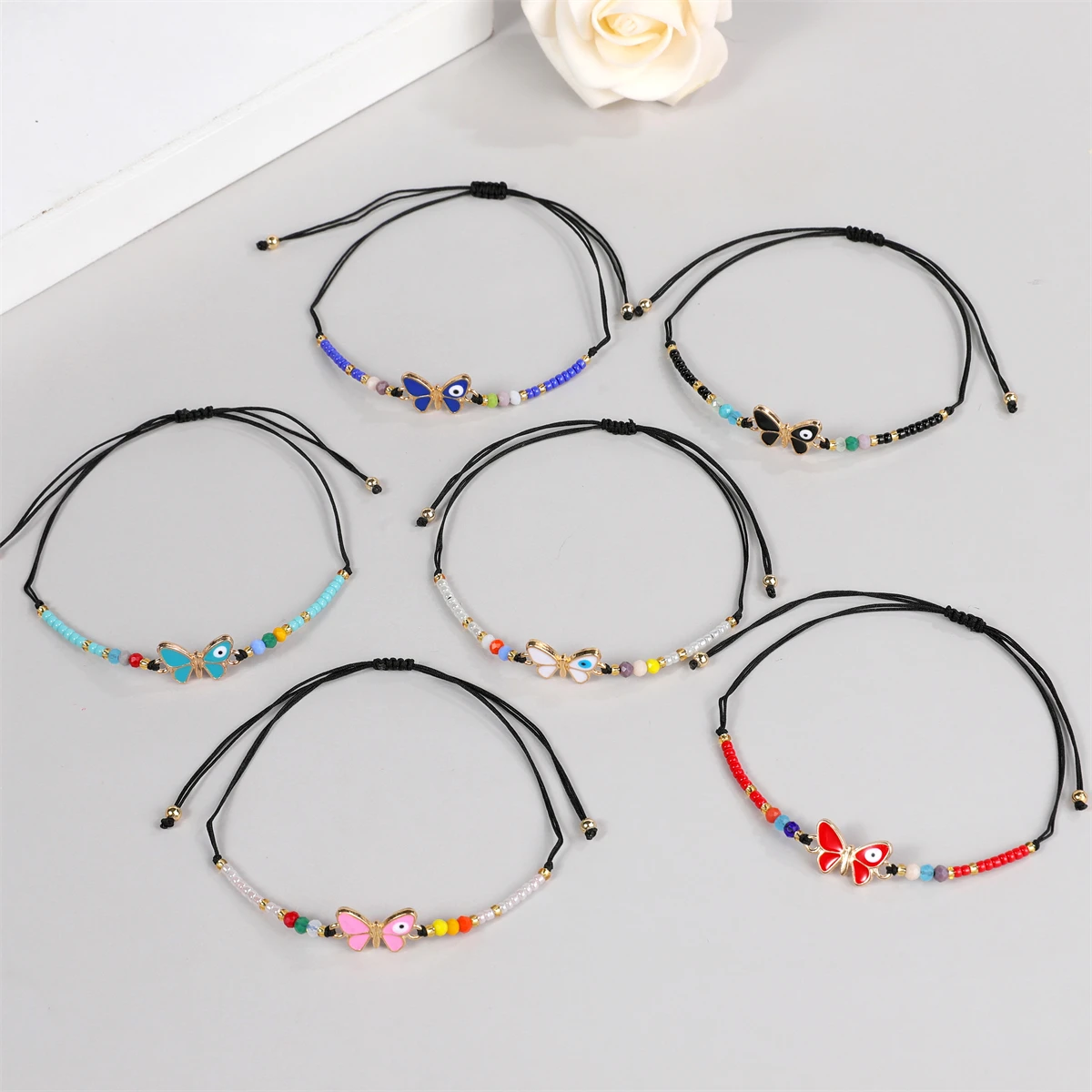 12pcs/lot Women Colorful Crystal Beads Butterfly Pendant Charms Bracelets Child Braided Adjustable Rope Chain Anklets Jewelry