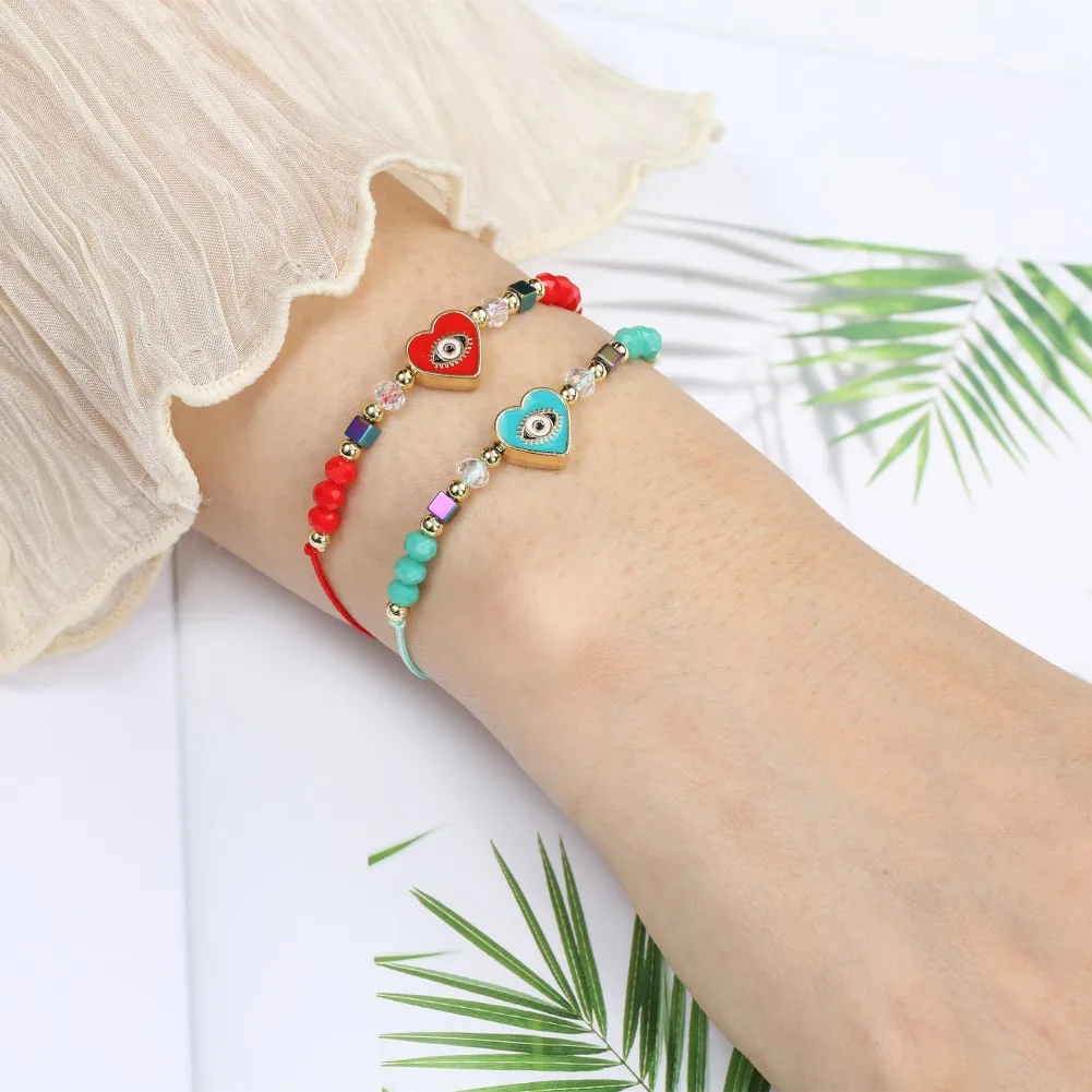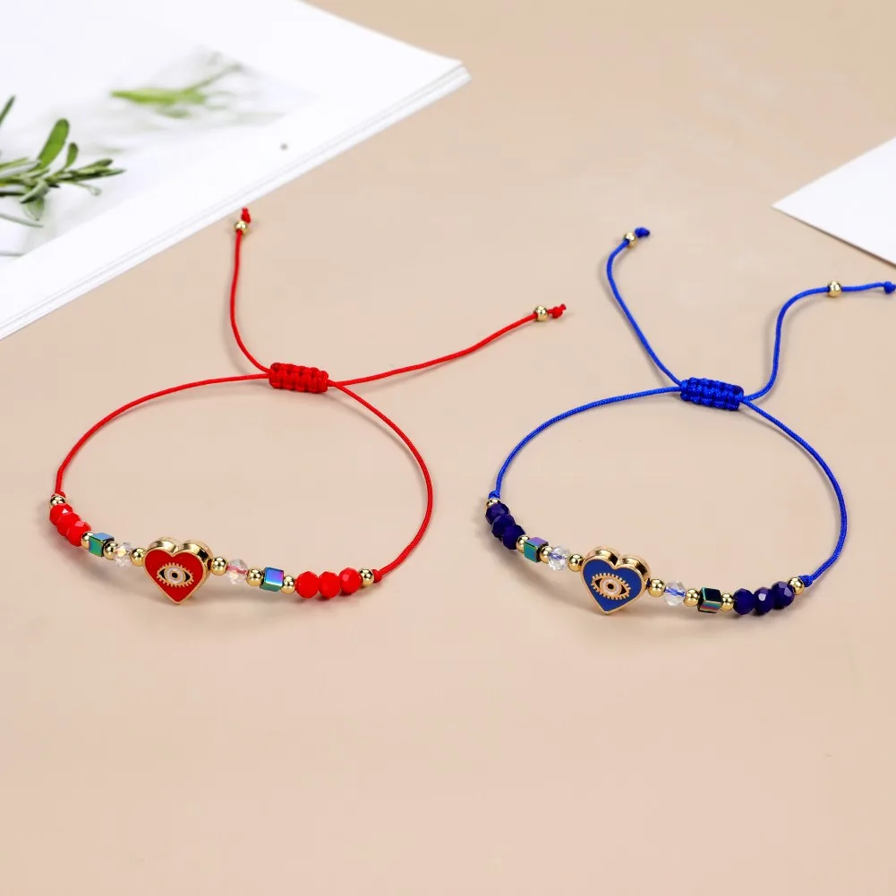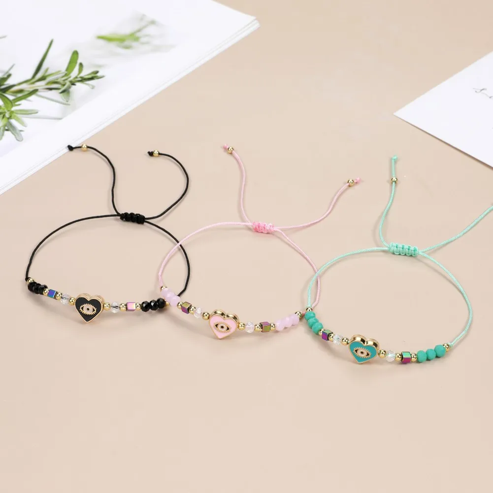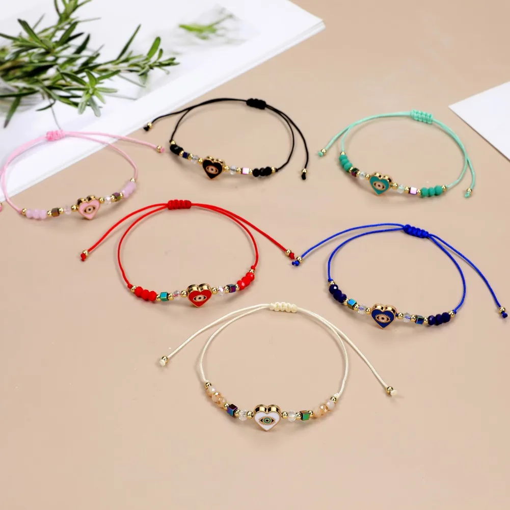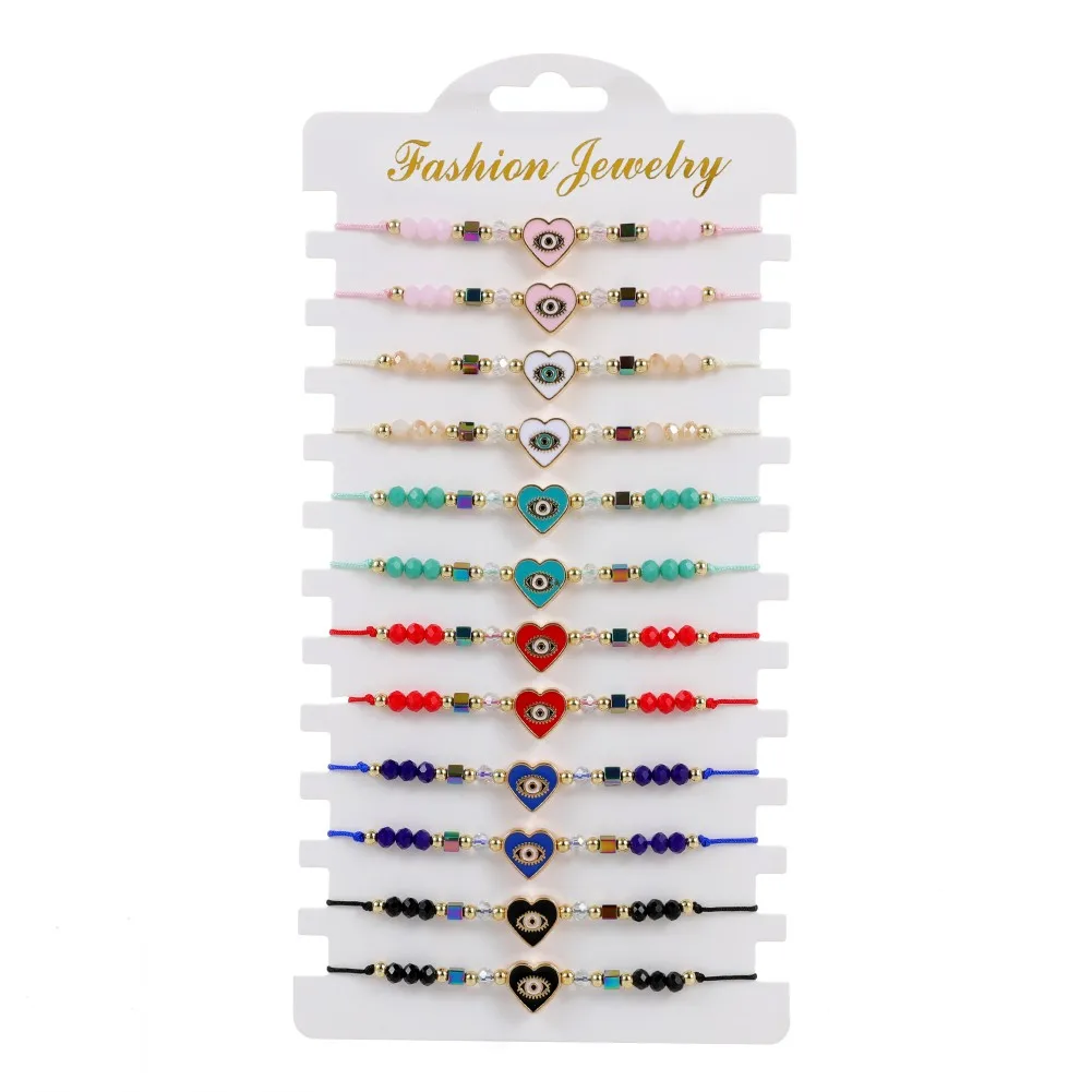 12pcs Love Heart Charms Bracelets for Women Rhinestone Beads Woven Rope Braided Evil Eye Bracelet Bangle Child Fashion Jewelry