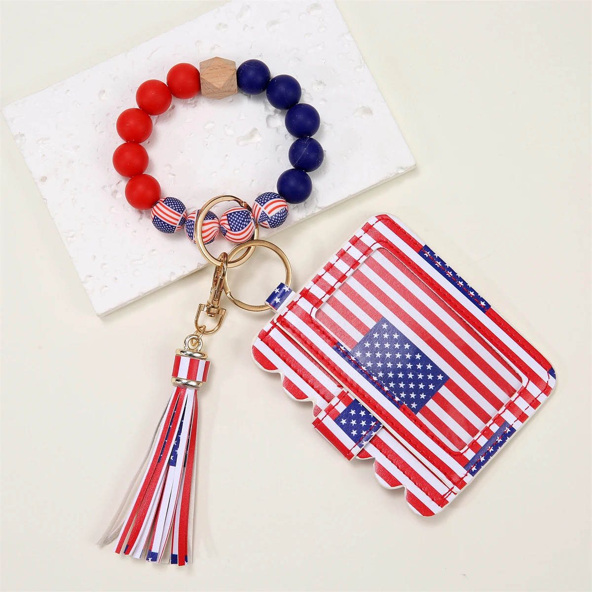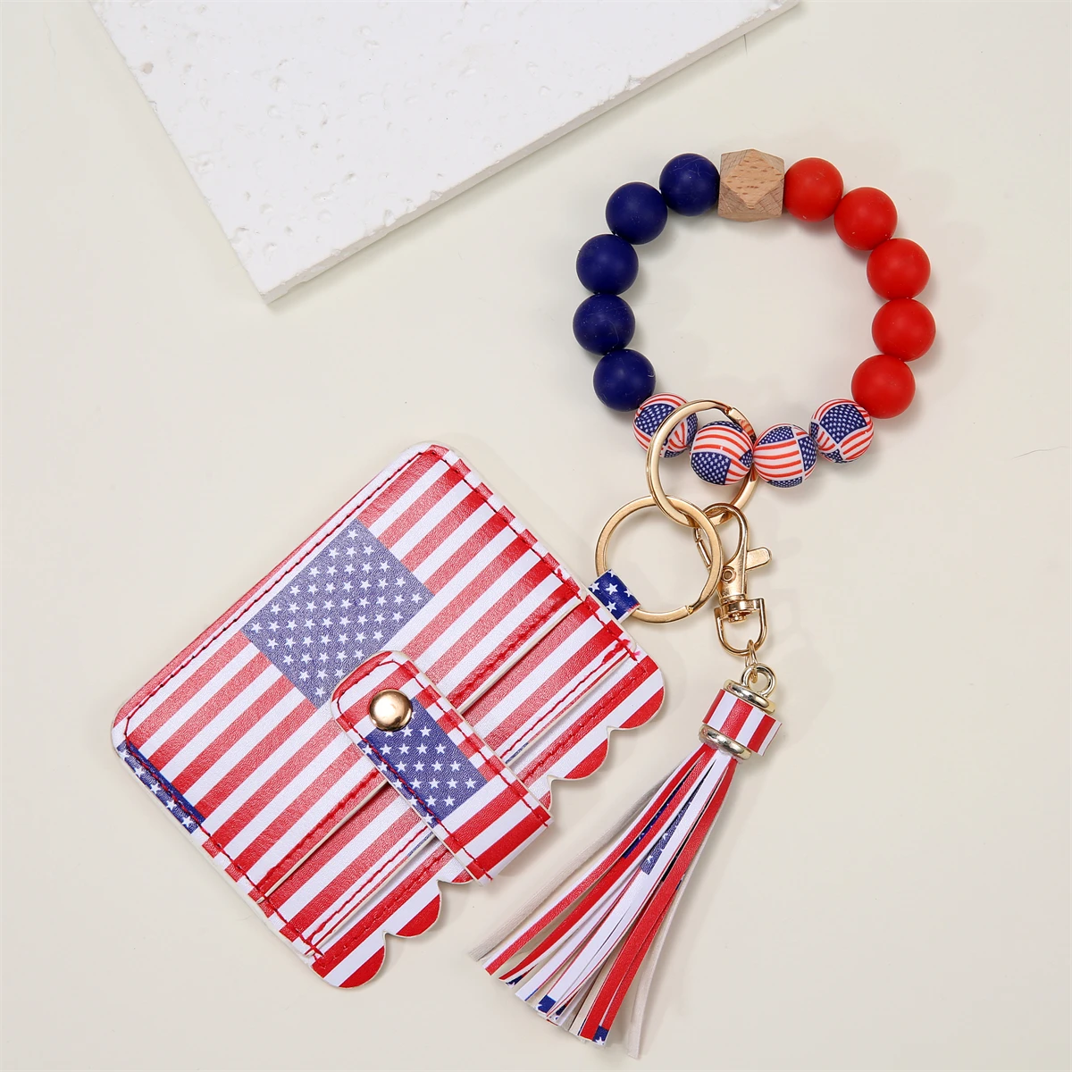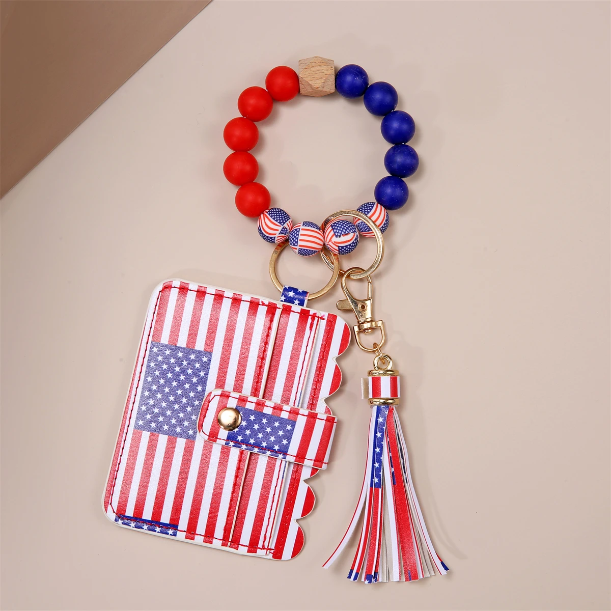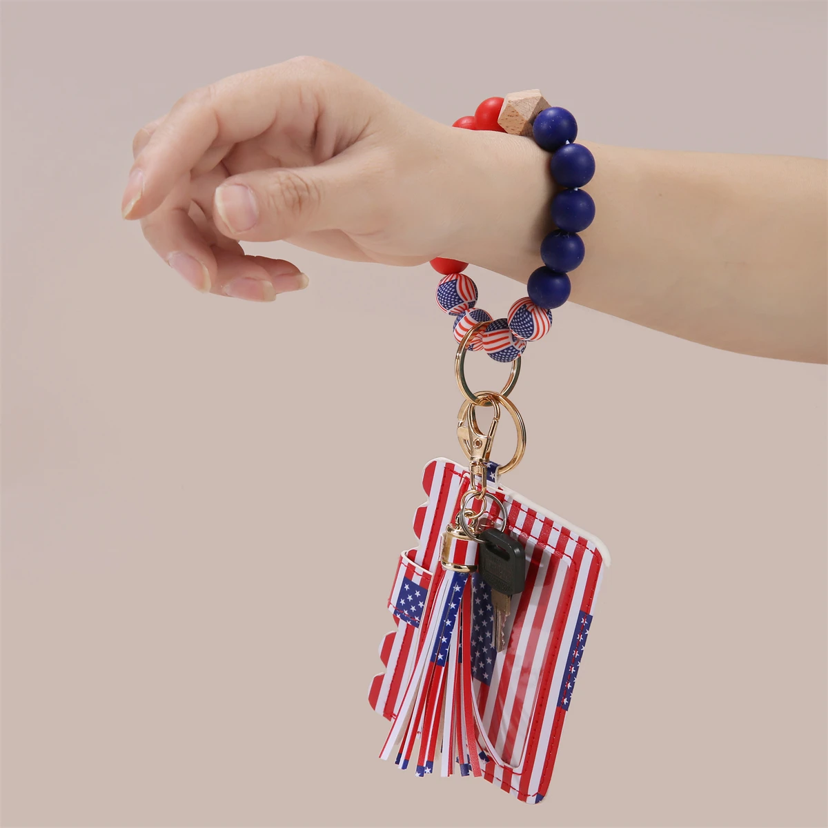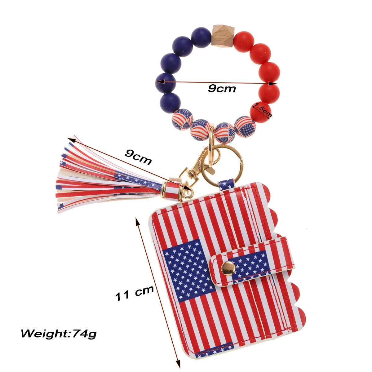American Flag Wristlet Bracelet Keychain Wallet for Women Credit Card Holder Tassel Keyring Bangle Lipstick Holder