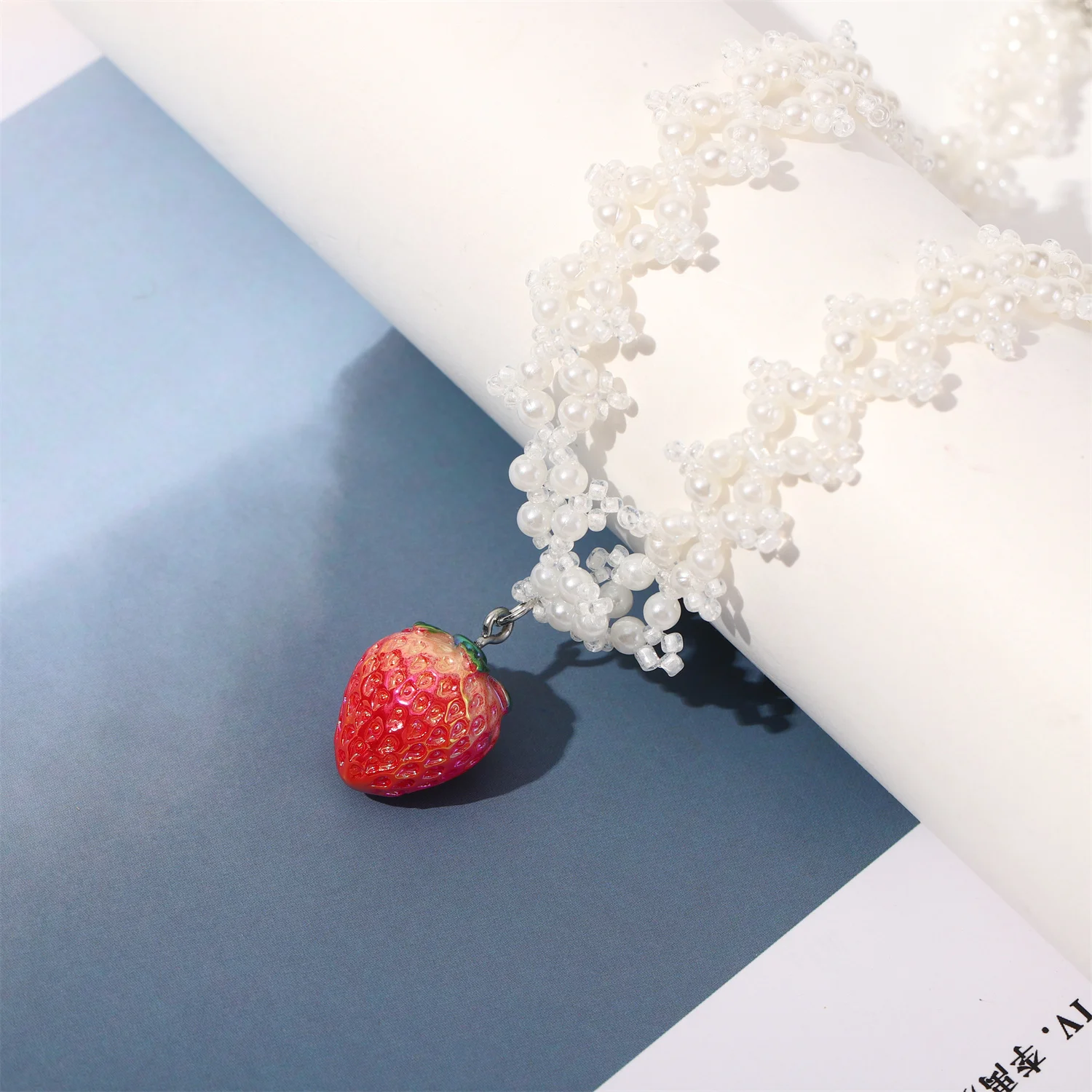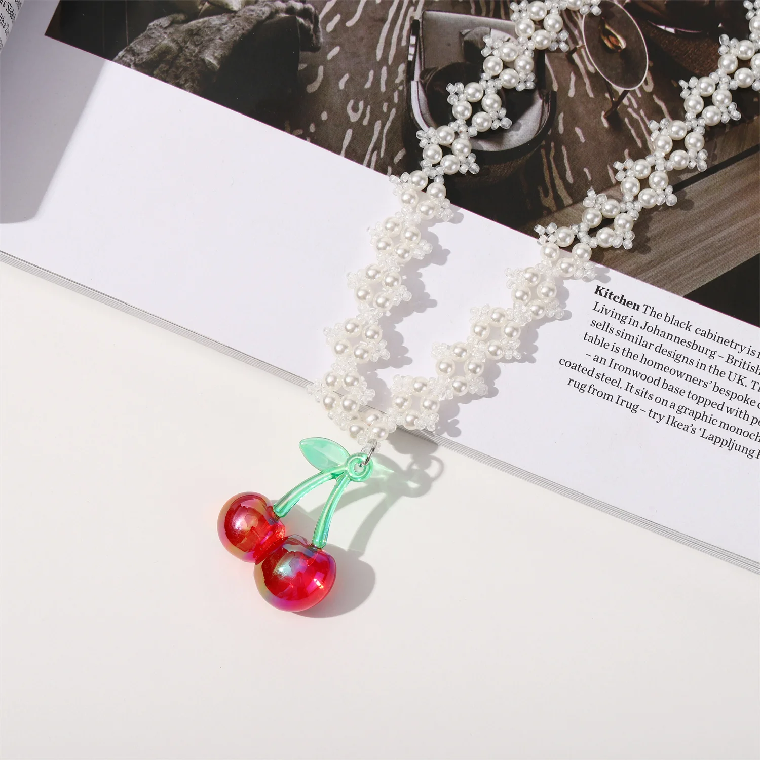 Fashion Red Cherry Strawberry Pendant Pearl Chain Women's Necklace Choker Charm Metal Sweater Chain Women Resin Jewelry Gift