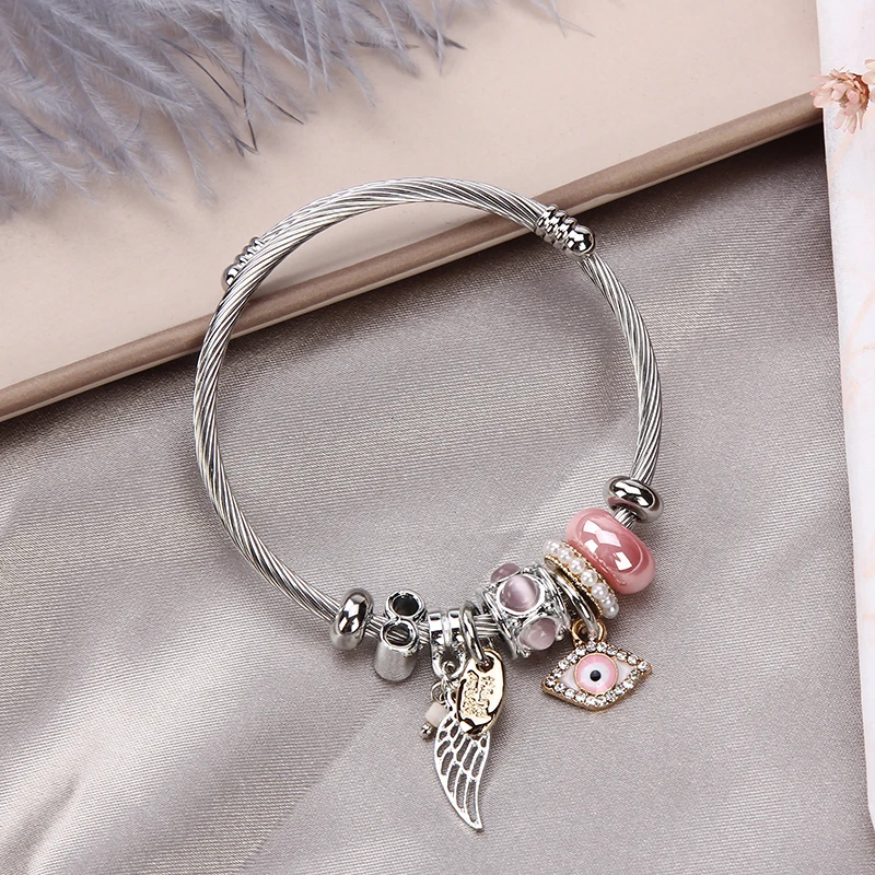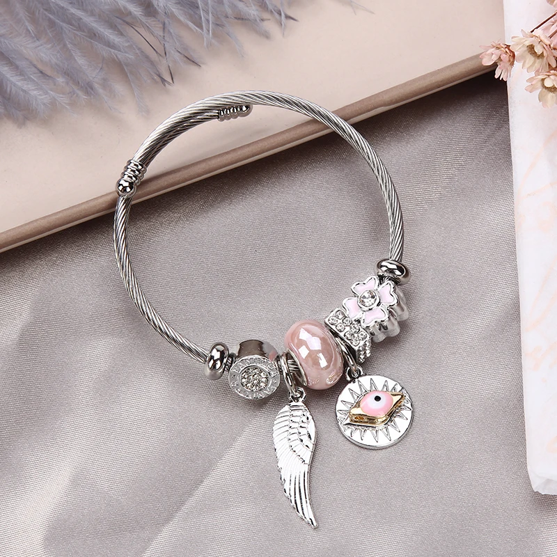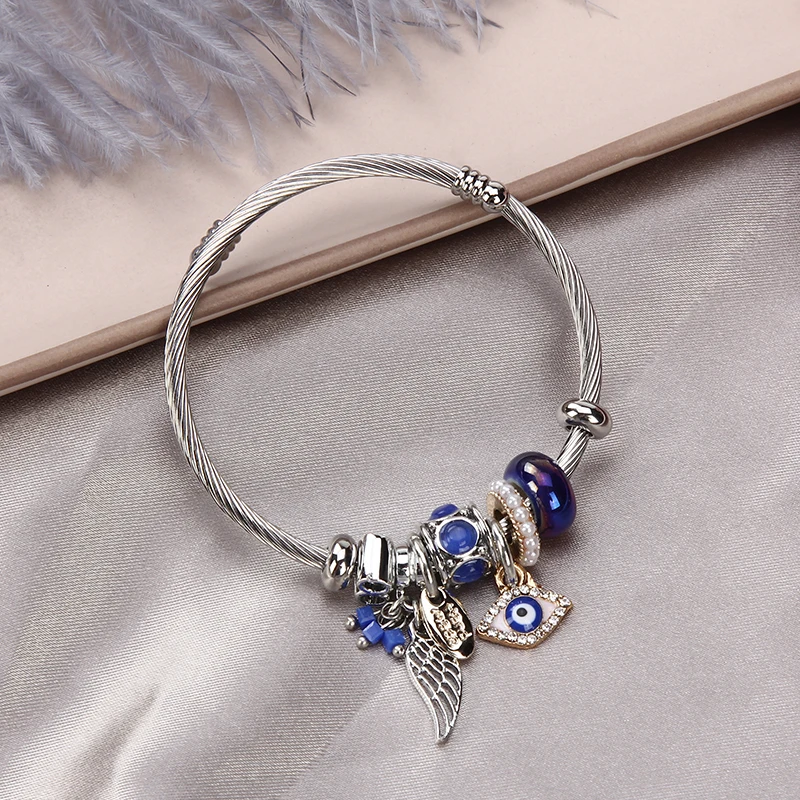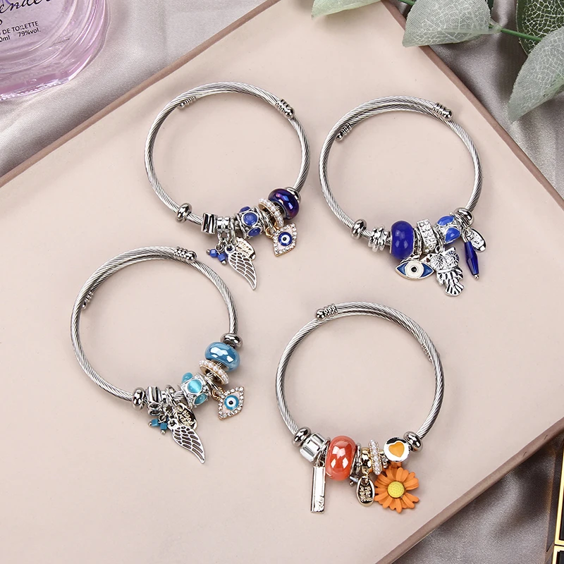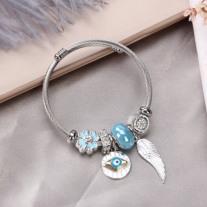 Women Stainless Steel Evil Eye Flower Charms Bracelets Wire Cable Rhinestones Open Adjustable Cuff Bangle Jewelry