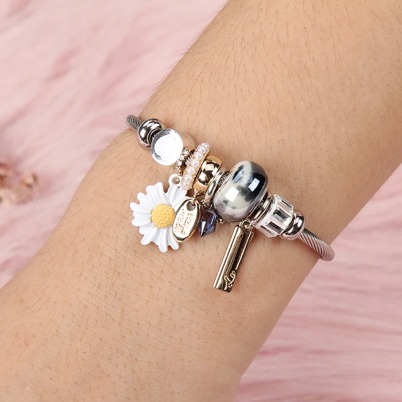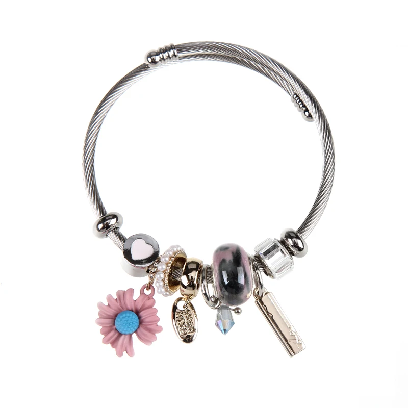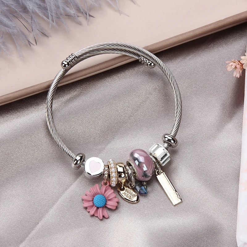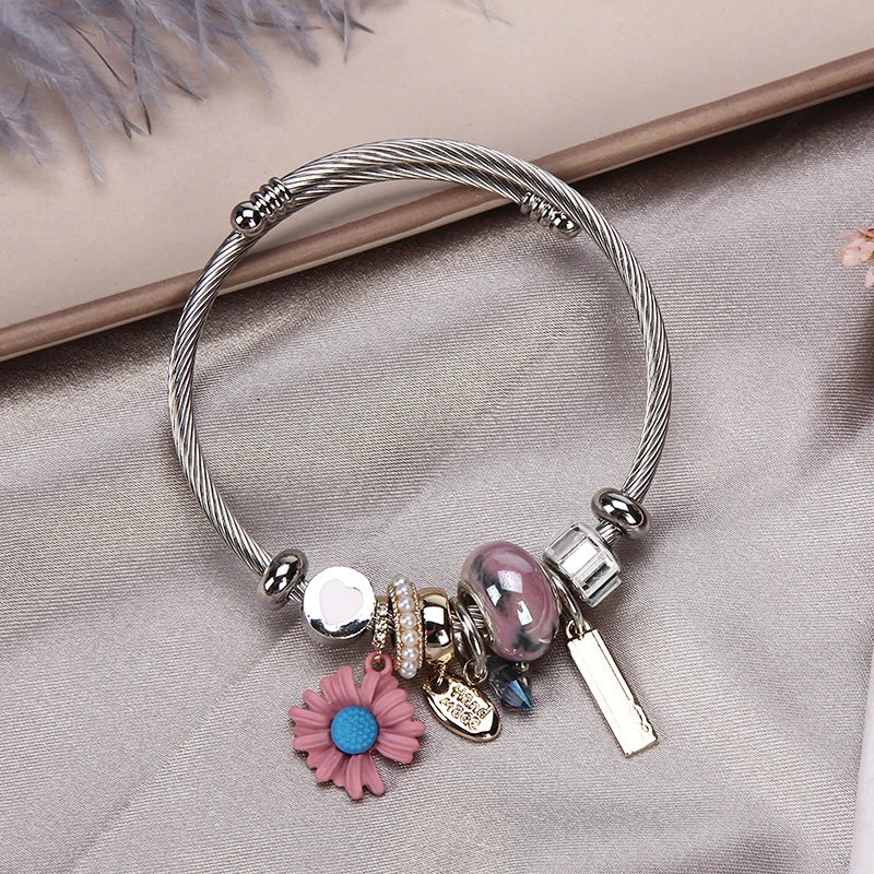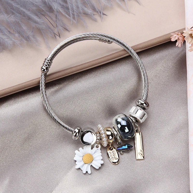 Women Stainless Steel Evil Eye Flower Charms Bracelets Wire Cable Rhinestones Open Adjustable Cuff Bangle Jewelry